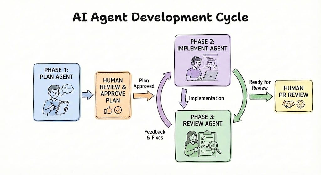 - Review Agent: Compared implementation to plan, reviewed code, passed back for fixes until ready for human review.
