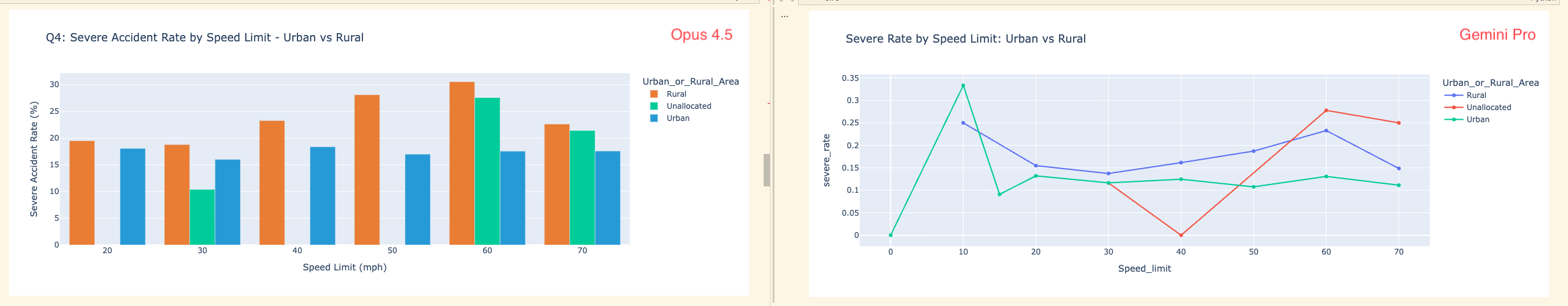 Opus used bar charts; Gemini used line charts. The bar chart makes the trend obvious: rural areas are more dangerous than urban for certain speed buckets. Gemini's line chart is harder to read, and its data cleaning left outliers around 10 mph.
